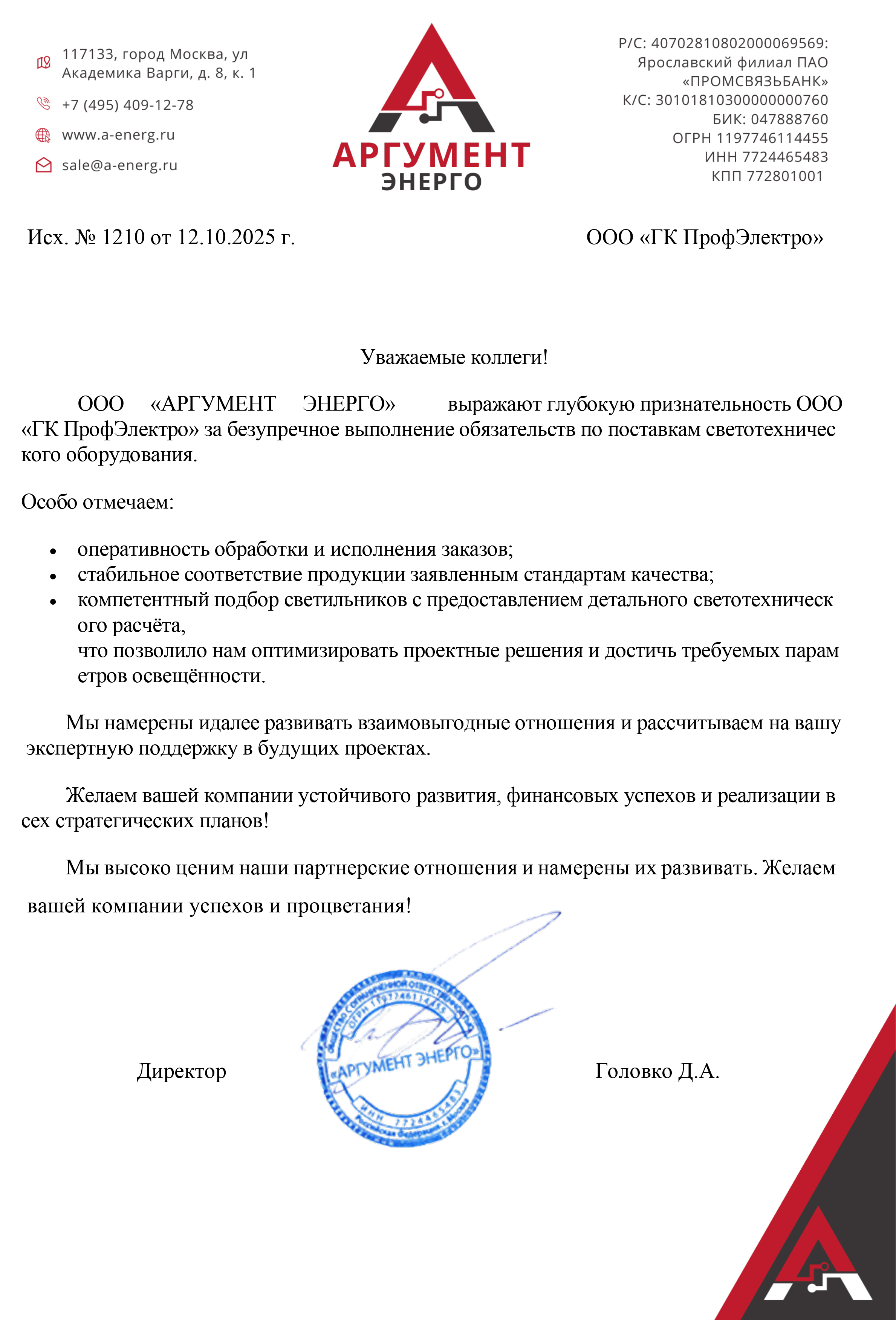 Мы сотрудничаем с Вами на протяжении 2,5 лет и стоит отметить амбициозность, нацеленность на результат и уважение к партнерам со стороны всей команды. Также хочется подчеркнуть "нескромность" и агрессивность в хорошем смысле, которые помогают достигать поставленные цели. Нашим взаимод...ействием доволен, наблюдается положительная динамика роста, развитие в группах Электрика и Светотехника. Более того, сотрудничество с ПрофЭлектро дает опыт введения управленческих и административных решений. В рабочих процессах взаимодействую в основном с Буянкиной Юлией и Кирюхиной Светланой, все отлично, активные, увлеченные, требовательные сотрудники!